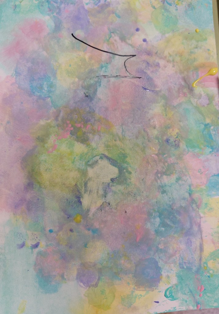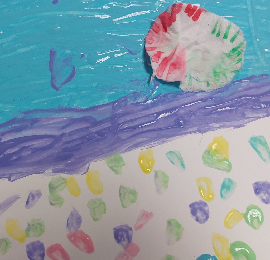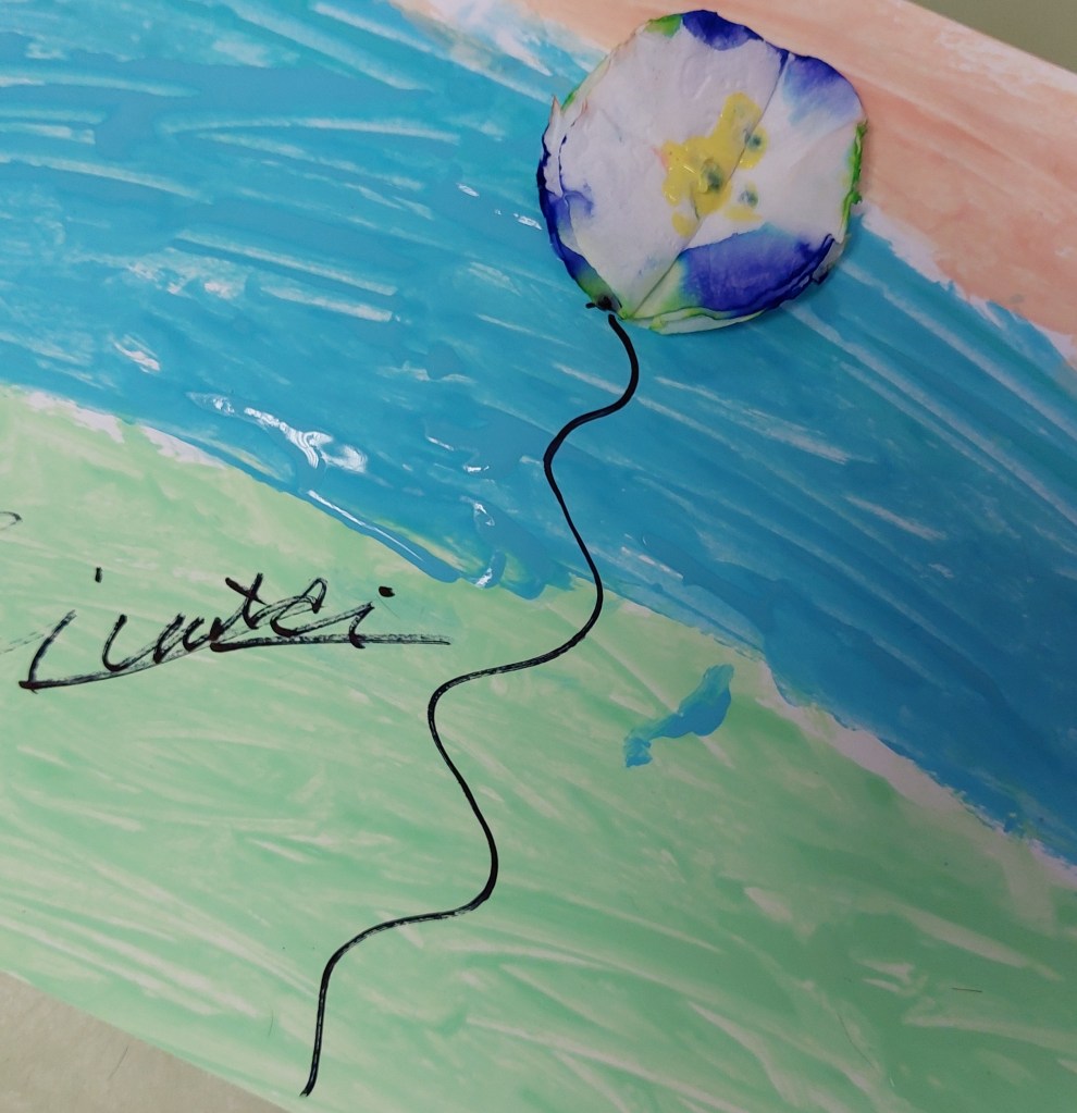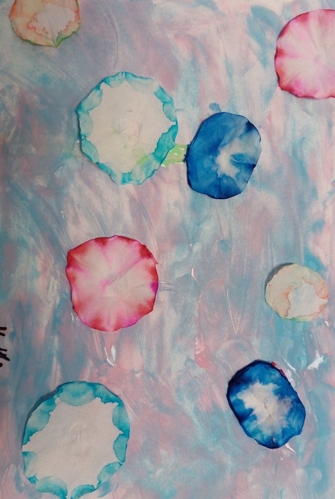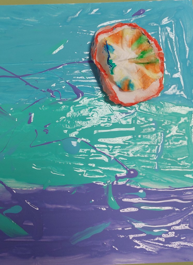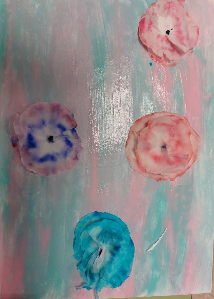 Como veis en las imágenes, hemos utilizado temperas para el fondo de un cuadro en el que las flores son las protagonistas. Las hemos realizado con varias capas de papel fino y rotulador. Por último, unas gotas de agua han ido desplazando la pintura obteniéndose así un bonito resultado.
