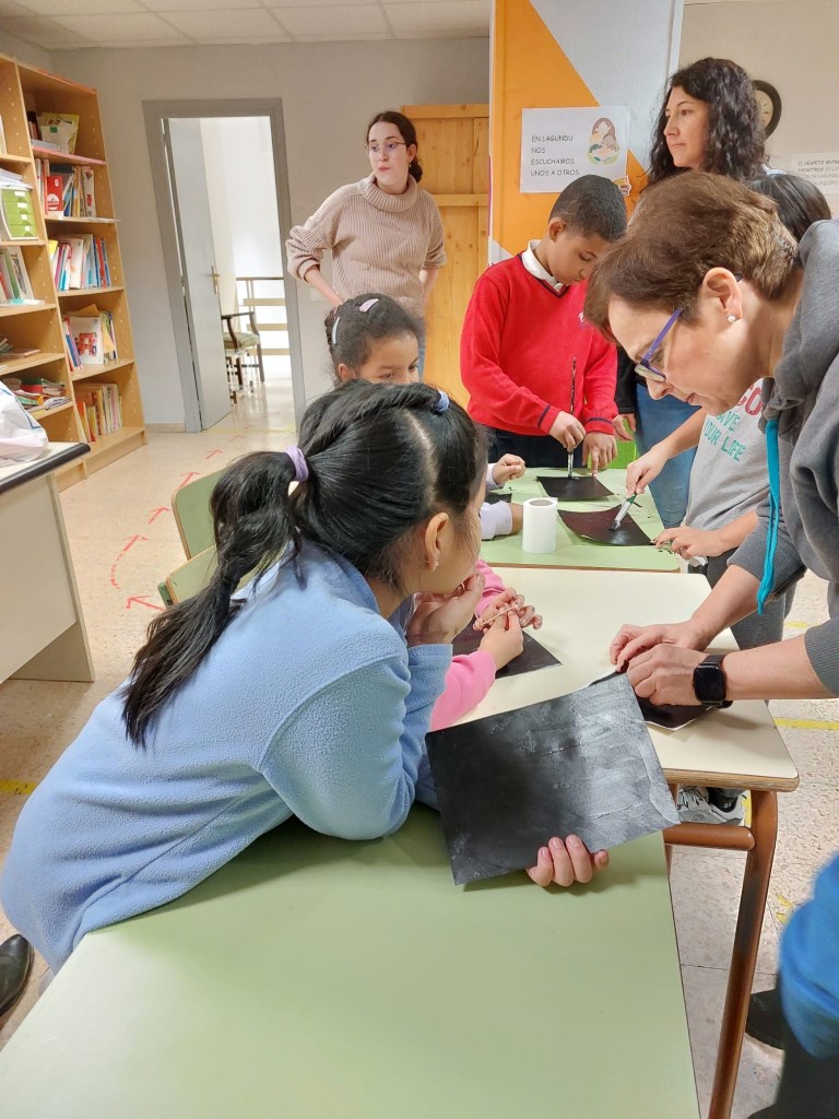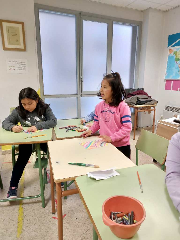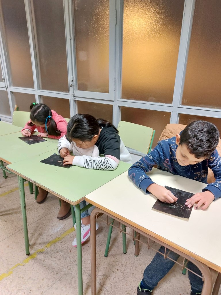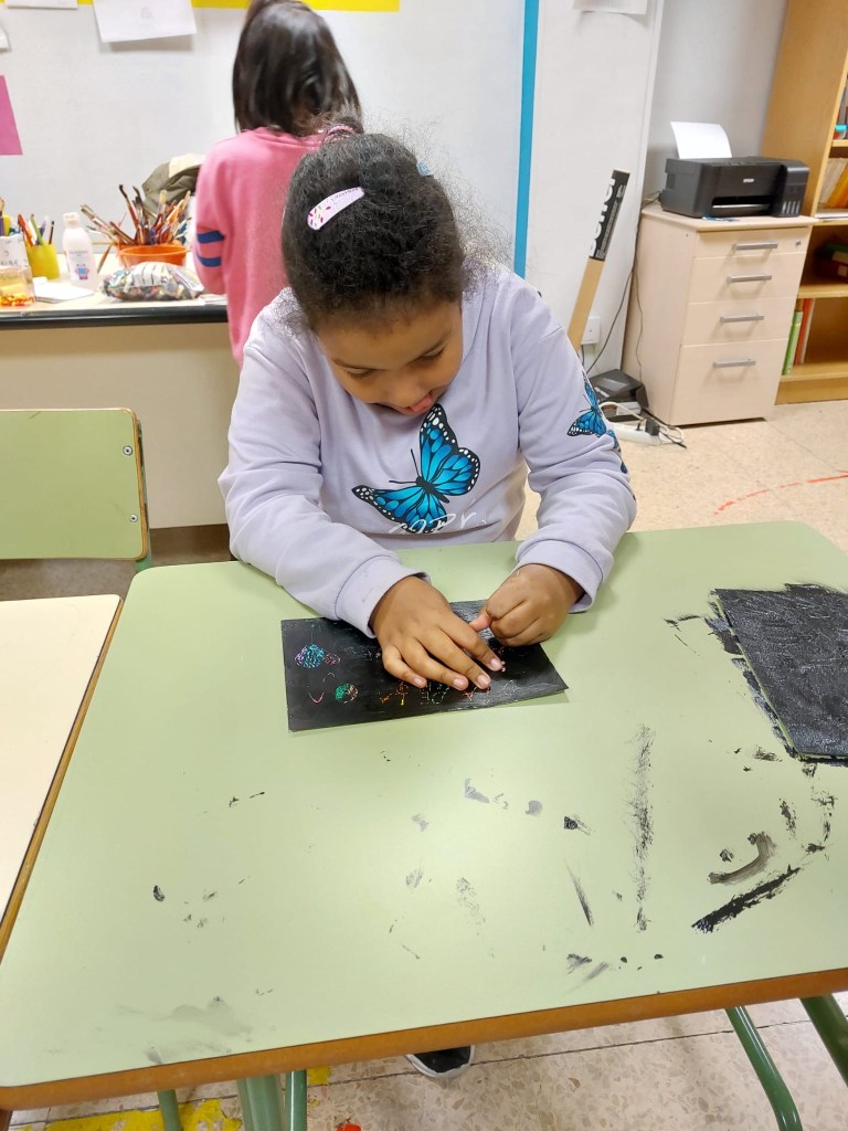 El viernes aprendimos a hacer dibujos esgrafiados: pintamos con ceras, después pusimos polvos de talco sobre todo nuestro dibujo, luego pintamos con témperas y después de que se secara, quitamos la témpera con un palillo o algo con punta y sacamos el color de las ceras cada uno a su manera. Con esto cultivamos la expresión artística, la distribución espacial… pero sobre todo, pasamos un rato muy divertido todos juntos