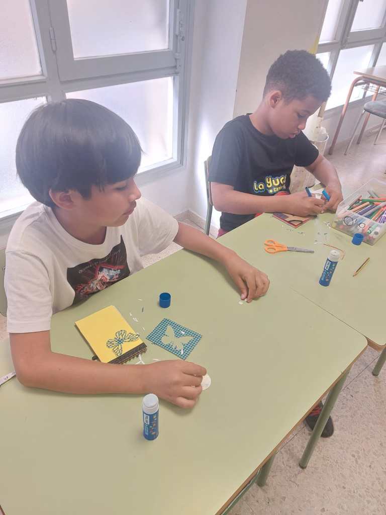 El pasado viernes, último día de actividades en Lagundu hasta el campamento urbano, estuvimos decorando libretas. Siempre buscamos maneras de inspirar la creatividad y por eso, equipados con blocs , pegatinas, pinturas, cartulinas y una gran variedad de materiales decorativos, cada niño tuvo la oportunidad de dejar volar su imaginación y personalizar su propia libreta. Estaban entusiasmados, cada uno eligió los materiales que mas le gustaron y se pusieron manos a la obra, a diseñar. Al final, todos los niños y niñas compartieron sus resultados. Después, hubo tiempo para juegos.