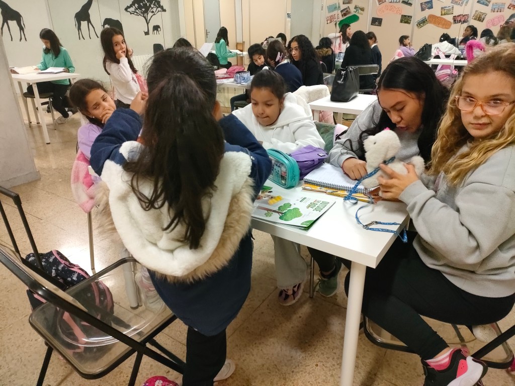 Y el Viernes, una manualidad nueva: abanicos de animales. ¡Nos encantaron! Y después, jugamos a la Abeja Reina y a relevos.