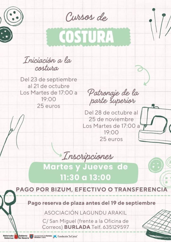 La actividad de costura se realiza los martes de 5 a 7 de la tarde y el precio es 25 euros. Consta de dos cursos, el primero de Iniciación a la costura y el segundo de patronaje de la parte superior.